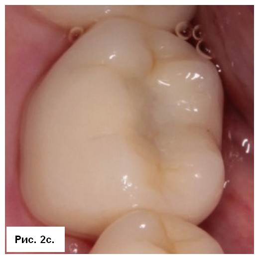 Симптоматика исчезла в последующие несколько дней. Второе посещение было проведено через 3 нед. Со слов пациента, зуб был асимптоматичным. После изоляции корневые каналы были вскрыты, проведена эвакуация гидроксида кальция. Затем каналы обтурировали биокерамическим силером BioRoot RCS (Septodont) методом одного штифта (рис. 2b) и выполнено композитное восстановление (рис. 2с). Была сделана послеоперационная радиография (рис. 3а), пациент записан на регулярные осмотры.