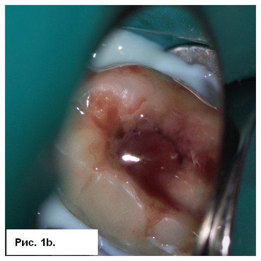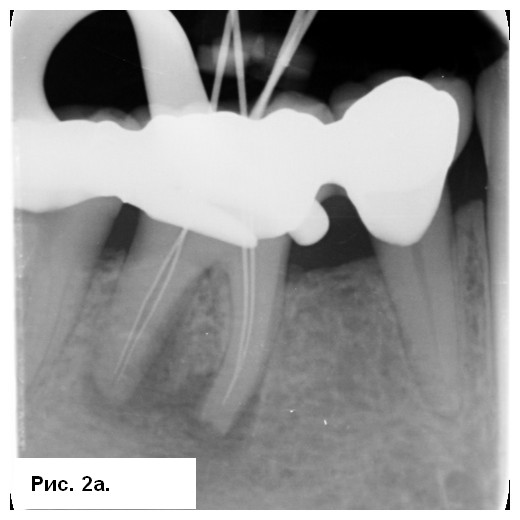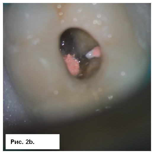 На рентгенограмме (рис. 1а) отмечались большие радиолюсцентые очаги на обоих корнях. Был поставлен диагноз: «некроз пульпы и острый апикальный абсцесс зуба 46». После консультации со стоматологом-ортопедом было принято решение провести эндодонтическое лечение с доступом к корневым каналам через существующую коронку. После вскрытия полости зуба было получено большое количество гнойного отделяемого с кровью (рис. 1b). Дренажу благоприятствовала ирригация 3 % NaOCl (рис. 1с), проведена инструментация корневых каналов системой 2Shape (MICRO-MEGA) и определена рабочая длина (рис. 2.а). Корневые каналы были заполнены гидроксидом кальция.